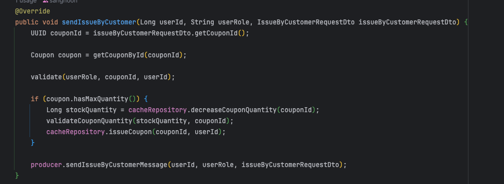 - 쿠폰 발급 요청이 오면 선착순 쿠폰일 경우 redis에서 수량을 감소시키고 재고를 확인한다.