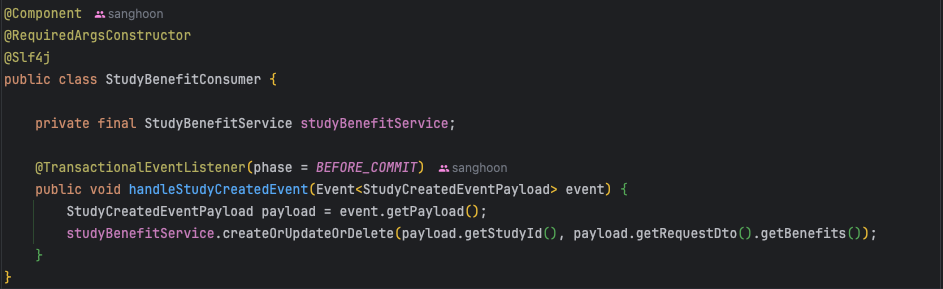 이때 EventListener를 보면 @TransactionalEventListener를 사용한 것을 확인할 수 있습니다. 그 이유는 Study를 생성할 때 study의 하위 도메인(benefit, rule 등)도 함께 생성하는데, 만약 이 중 하나라도 잘못된 요청으로 트랜잭션이 롤백되면 모두 동일 트랜잭션을 통해 롤백하기 위함입니다.