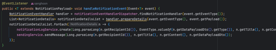 이를 통해 알림 이벤트 리스너에서는 불필요하게 모든 Event를 받아서 처리할 필요가 없이 Event<NotificationPayload>만 받아서 처리하게 되어 효과적으로 리스너 필터링이 구현되었습니다.